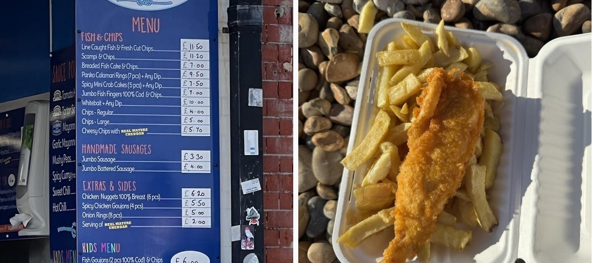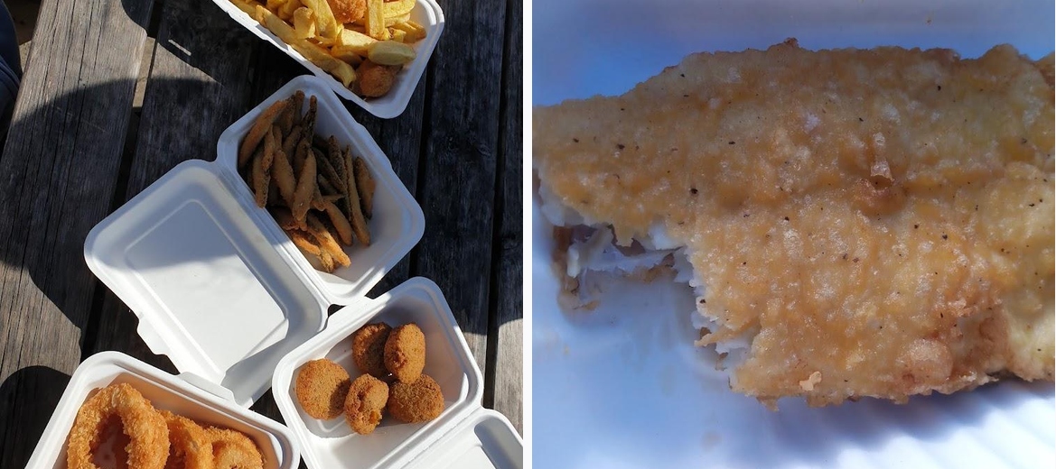 Lovely fresh cod and chips not soggy, batter crispy not all greasy, scampi was excellent, staff were particularly pleasant and helpful considering it was a busy bank holiday, great spot right on the beach. Will definitely go again.